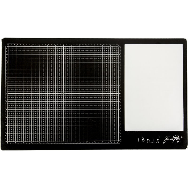 Tim Holtz Glass Media Mat med to arbejds områder. Det sorte i str. 12 x 14 Inch, som er det primære arbejdsområde når du skal skære, male og lave Mixed Media. Pladen kan vaskes eller man kan skrabe evt. rester af uden at ødelægge den.
