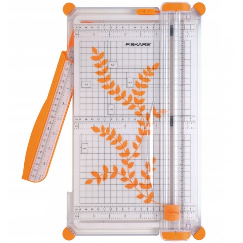 Højpræcisions skæremaskine fra Fiskars med aluminiumsoverflade, påtrykte hjælpelinier og udsvingslineal til store papirformater.