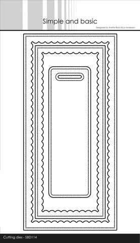 Dette die sæt består af 3 dies – 2 stk. rammer med indvendig scallop og piercing samt et aflangt tag.